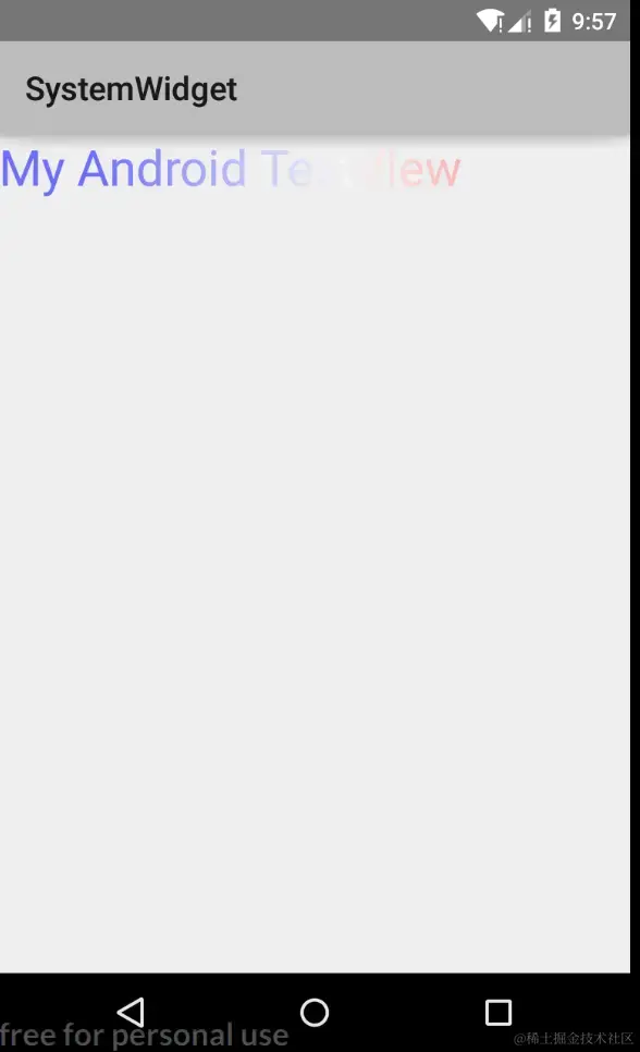 下面再来看一个稍微复杂一点的TextView。在前面一个实例中,我们直接使用了Canvas对象来进行图像的绘制,然后利用Android的绘图机制,可以绘制出更复杂丰富的图像。比如可以利用LinearGradient Shader 和Matrix来实现一个动态的文字闪动效果,程序运行效果如下图所示。