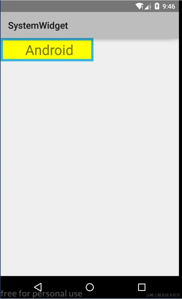 而代码中最重要的部分则是在onDraw()方法中,为了改变原生的绘制行为,在系统调用super.onDraw(canvas)方法前,也就是在绘制文字之前,绘制两个不同大小的矩形,形成一个重叠效果,再让系统调用super.onDraw(canvas)方法,执行绘制文字的工作。这样,我们就通过改变控件绘制行为,创建了一个新的控件,代码如下所示。