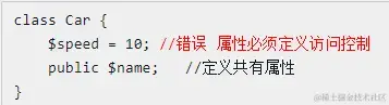 属性声明是由关键字 public,protected或者private开头,后面跟一个普通的变量声明来组成。 -