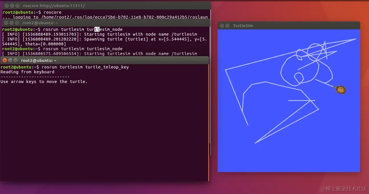 注意两点: 1.以上三条命令需要分别依次打开三个终端窗口进行输入执行; 2.需要将光标焦点停留在最后一个(即第三个)终端窗口上才可调动乌龟;