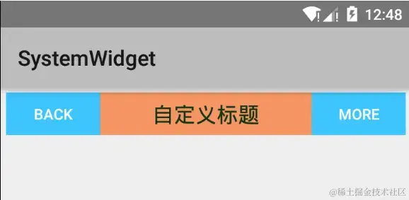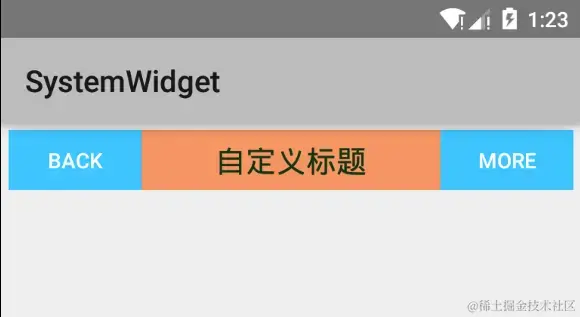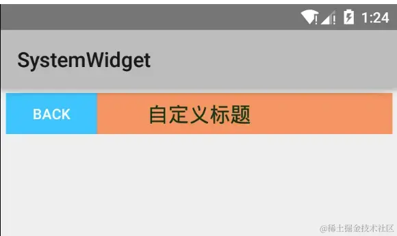 创建复合控件可以很好地创建出具有重用功能的控件集合。这种方式通常需要继承一个合适的ViewGroup,再给它添加指定功能的控件,从而组合成新的复合控件。通过这种方式创建的控件,我们一般会给它指定一些可配置的属性,让它具有更强的拓展性。下面就以一个TopBar为示例,讲解如何创建复合控件。 我们知道为了应用程序风格的统一,很多应用程序都有一些共通的UI界面,比如下图中所示的TopBar这样一个标题栏。