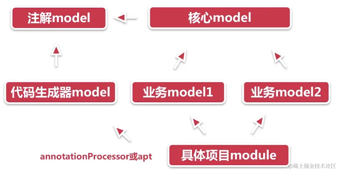 功能Module:只要与业务有一些联系或者有一些我们自定义的功能 具体项目Module:类型为application(applicationModule),包含项目的基础信息:如包名,applicationId,以及一些第三方平台需要的appId,appSecret; 注解Module:包含着各种annotation,配合着代码生成器; 代码生成器Module:通过annotationProcessor或apt调用的 实现动态生成代码功能的Module,微信登录与注册会用到06:35 可以通过annotationProcessor生成需要的类(编译器生成技术,既不会影响性能,也能绕过某些限制)