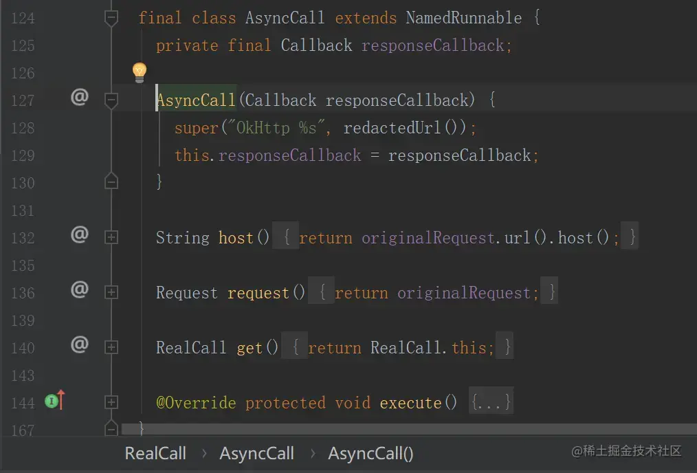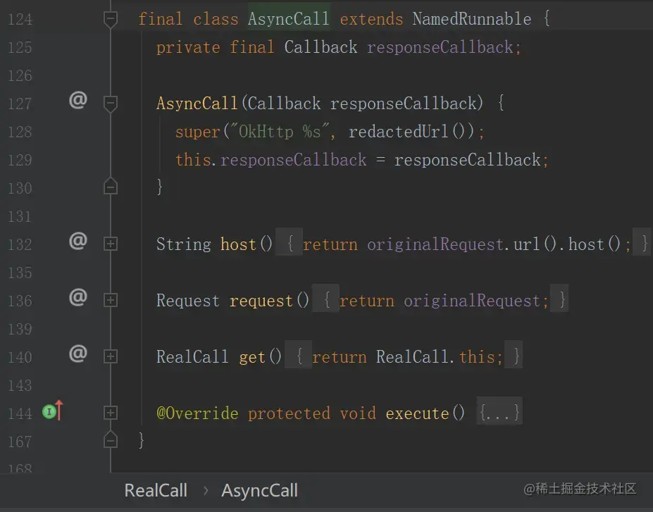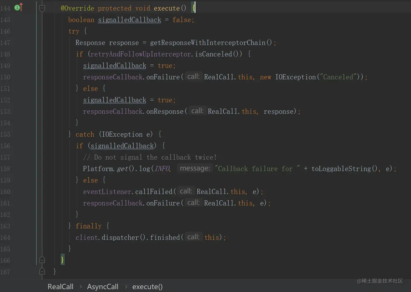 call实例的run()了;run()中主要是调用了execute()方法,即【38行】处定义的execute(), 接着跟踪其实现,到RealCall.AsyncCall # execute()这里:【147行】
