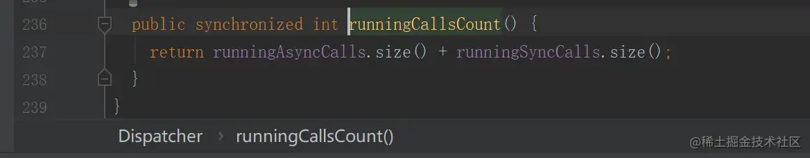 当前同步请求对应的Call 实例传进来, 然后202行,则是把该Call 实例从同步请求队列 runningAsyncCalls中 移除; 如果不能移除,就抛出异常 ——throw new AssertionError("Call wasn't in-flight!");; 当然这里注意是同步请求操作【execute()源码】,才是移除; 203行这里,由于同步请求这里promoteCalls位传false,这里不会走promoteCalls()方法; 204行,调用runningCallsCount()计算目前还在运行的请求,其实现如下:没什么特别的,就是直接返回正在执行的