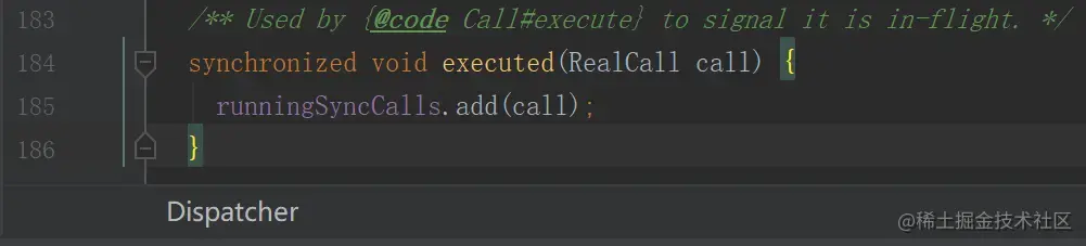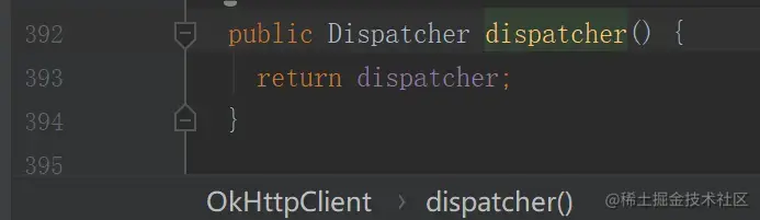 client.dispatcher().executed(this);dispatcher()方法放回一个Dispatcher对象,它是请求的分发器;