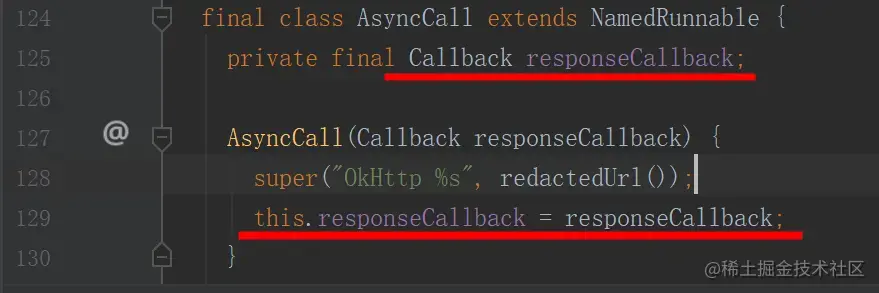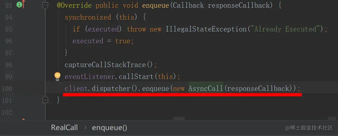 enqueue()源码中,100行这里,client.dispatcher().enqueue(new AsyncCall(responseCallback));就是通过传进来的Callback实例,封装好了一个Runnable实例【AsyncCall实例】, 接着通过client.dispatcher()获取Dispatcher实例并调用enqueue()将这个Runnable实例送进执行流程;
