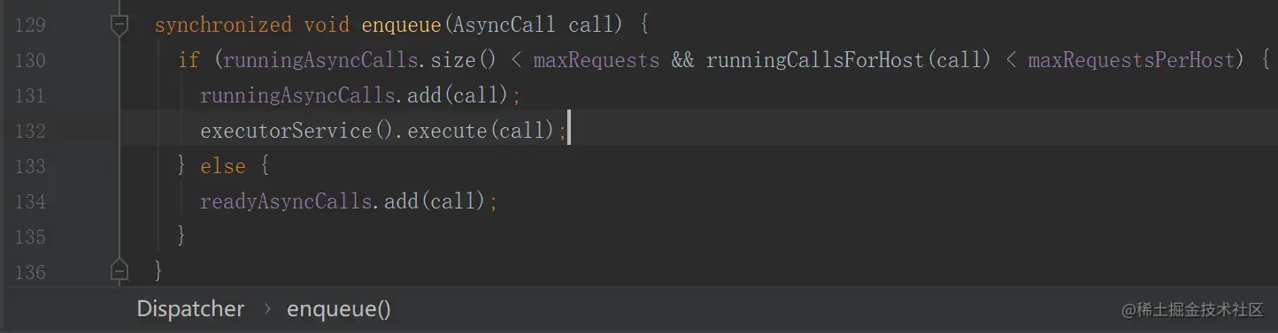 AsyncCall/Runnable实例 添加到runningAsyncCalls中【131行】, 然后会使用一个线程池去执行它;【132行executorService()会返回一个线程池对象】如果不满足, 则把这个传递进来的