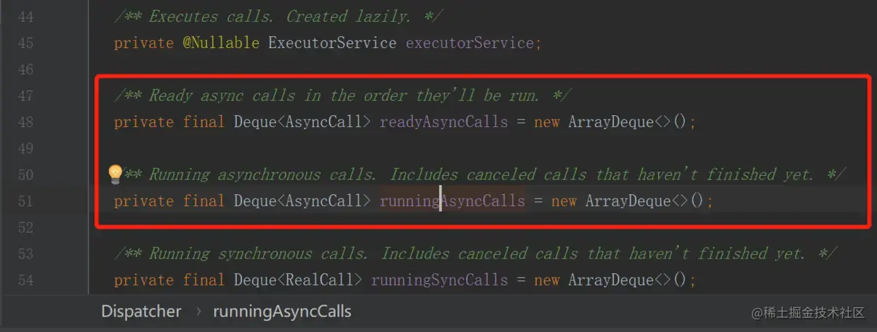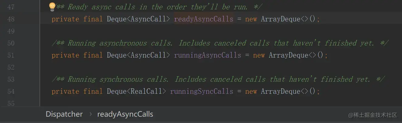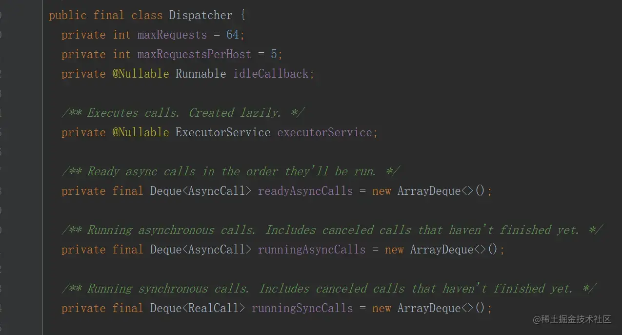 runningAsyncCalls--- 正在执行的异步请求; 注意看注释:列表还包含了已经取消、但没有执行完成(Finished)的异步请求;readyAsyncCalls--- 就绪状态的异步请求队列; 当某个异步请求 Call实例不满足条件时,则把这个异步请求 Call实例