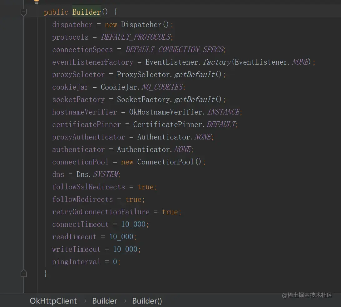 Builder是OkHttpClient中的一个内部类; 通过这个类我们可以配置请求的各种参数;- 注意第一行,是一个