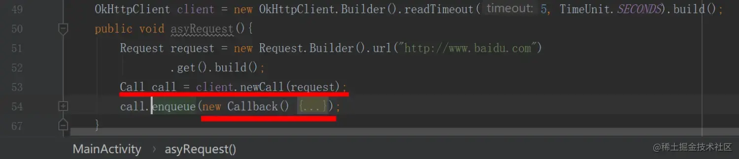 1.创建一个OkHttpClient对象; 2.构建携带请求信息的Request对象; 3.将Request实例赋给newCall()得到Call对象; 4.使用Call对象调用execute或者enqueue方法;