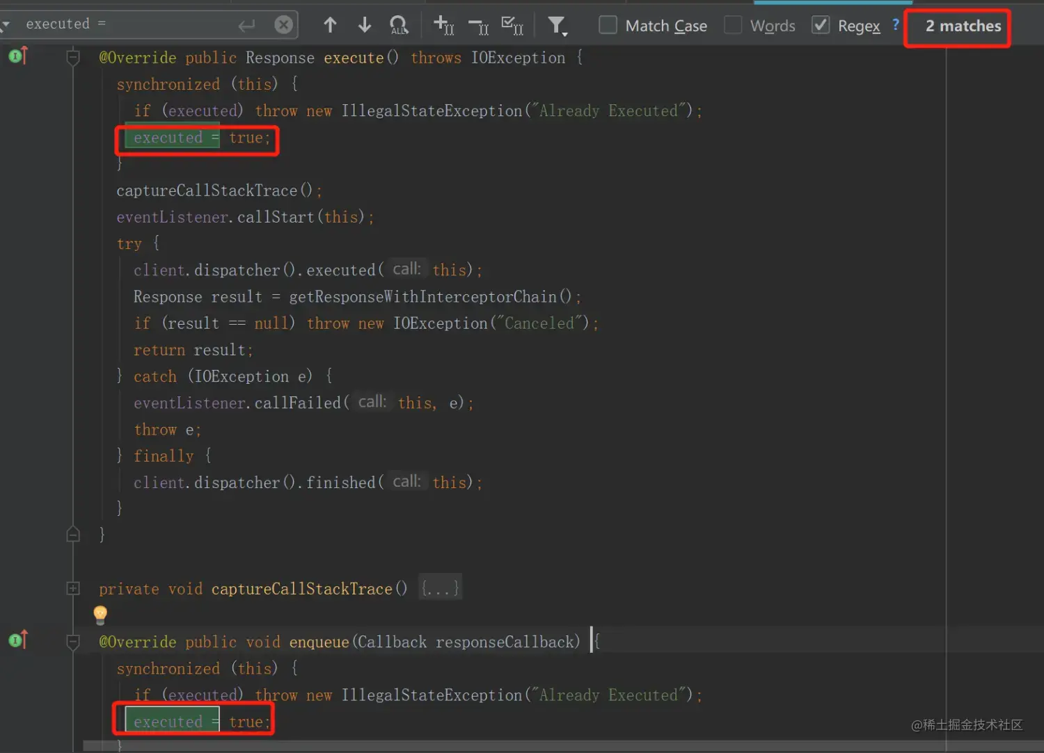 94行,首先,锁住当前RealCall对象; 95、96行,同上,用于控制 --- 同一个HTTP请求,只能执行一次; 首先,判断executed是否为true, 如果为true(请求执行过),就会抛出"Already Executed"异常; 没有执行过,则执行,同时executed置位;