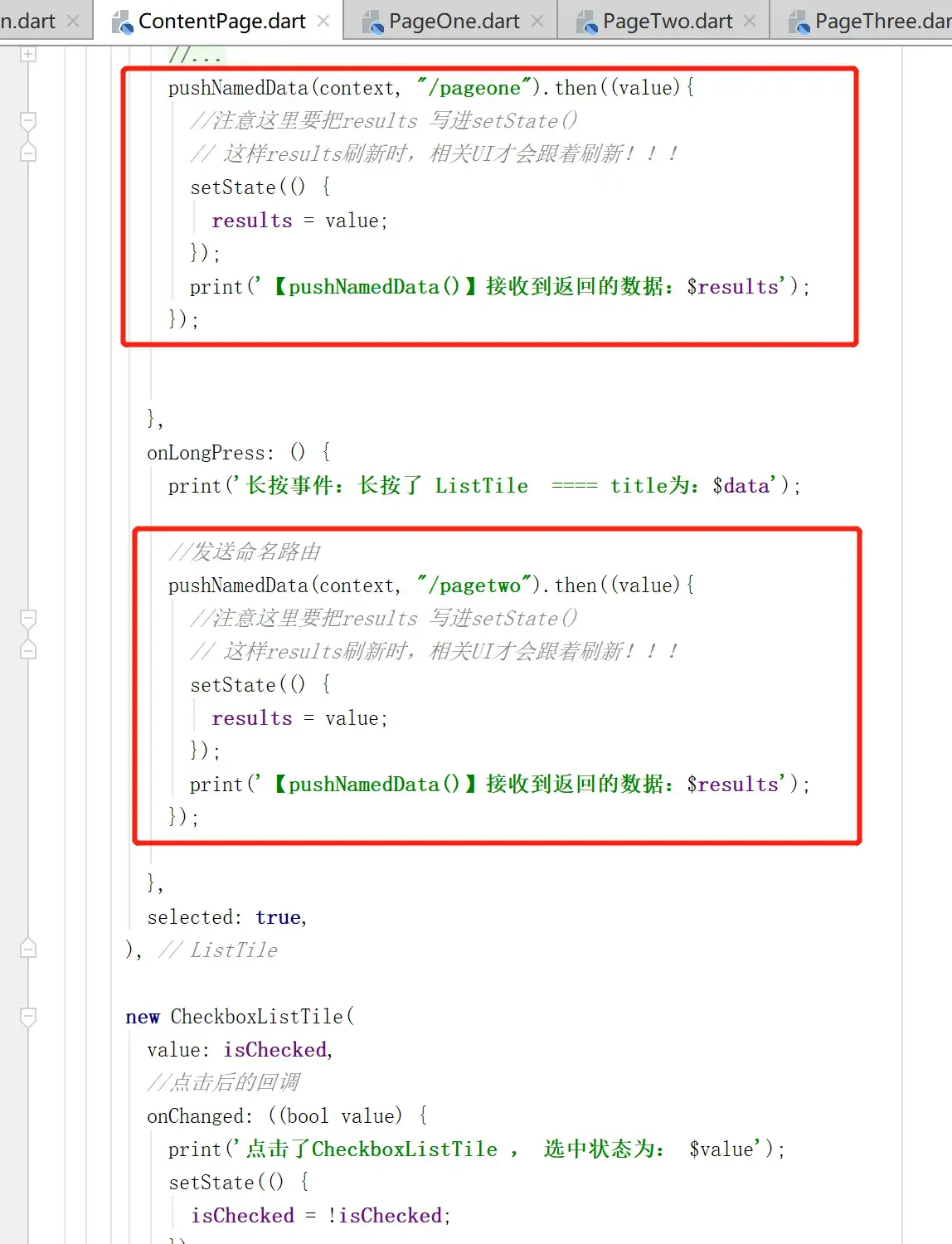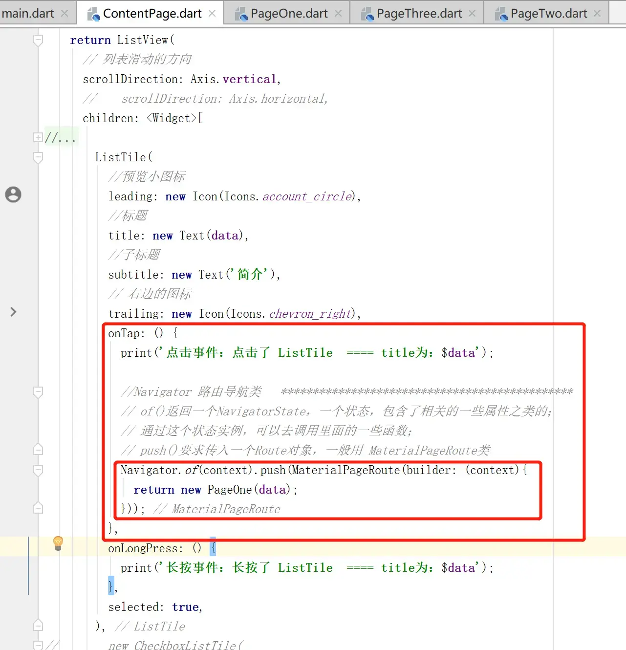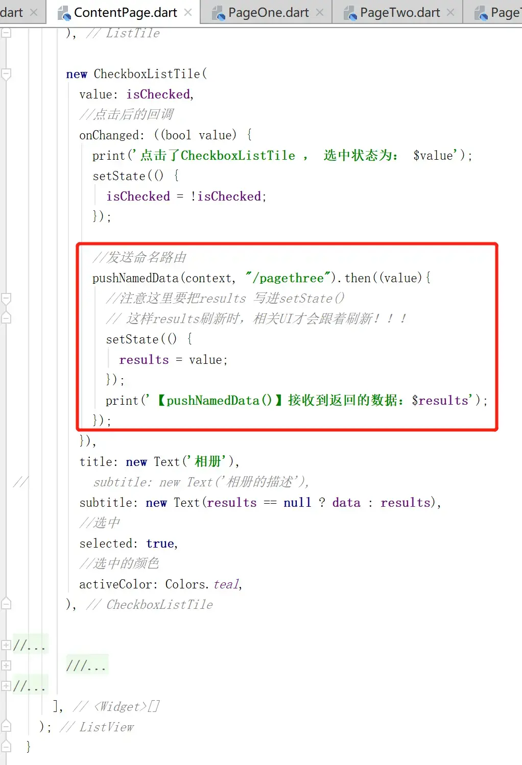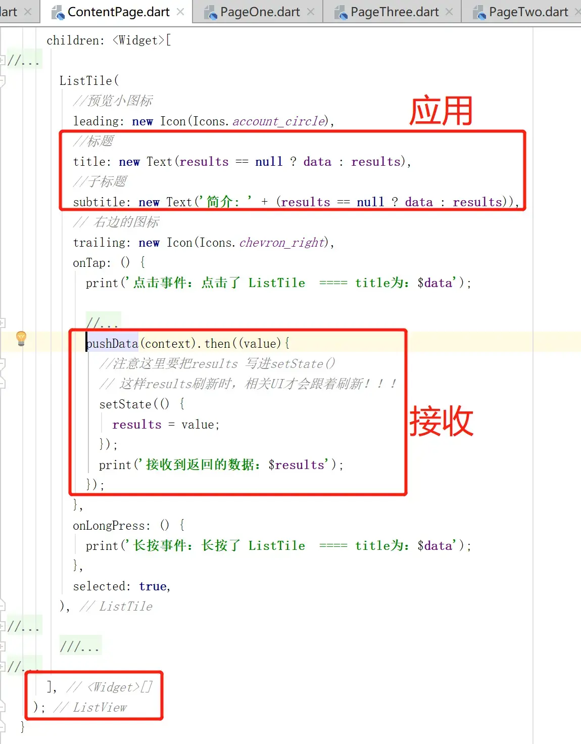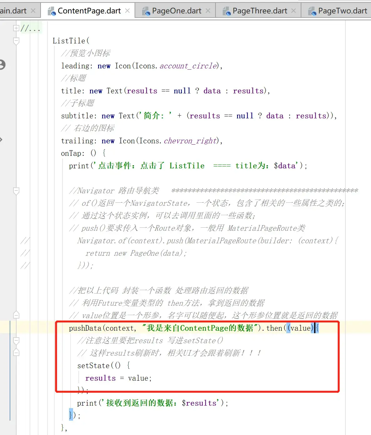 【接收其他页面返回来的数据】 PageOne跳回ContentPage, 通过pop跳回并返回数据:修改ContentPage (封装`pushData()`方法, 用于导航以及接收数据),** ``` String results; //封装一个函数 处理路由返回的数据 // 接收数据是异步的,需要加 async关键字; // 需要接收数据,需要加 await关键字; // 需要准备一个数据类型变量,来承载; // 指定函数返回类型为String,Alt+enter 改成 Future Future pushData(BuildContext context) async{ //Navigator 路由导航类 ********************************************** // of()返回一个NavigatorState,一个状态,包含了相关的一些属性之类的; // 通过这个状态实例,可以去调用里面的一些函数; // push()要求传入一个Route对象,一般用 MaterialPageRoute类 var datas = await Navigator.of(context).push(MaterialPageRoute(builder: (context){ return new PageOne(data); })); return datas; } ```  ``` ListTile( //预览小图标 leading: new Icon(Icons.account_circle), //标题 title: new Text(results == null ? data : results), //子标题 subtitle: new Text('简介: ' + (results == null ? data : results)), // 右边的图标 trailing: new Icon(Icons.chevron_right), onTap: () { print('点击事件:点击了 ListTile ==== title为:$data');