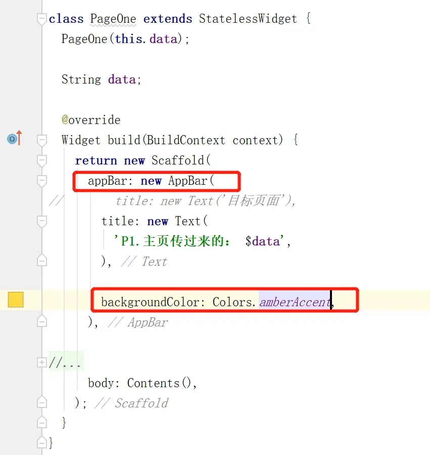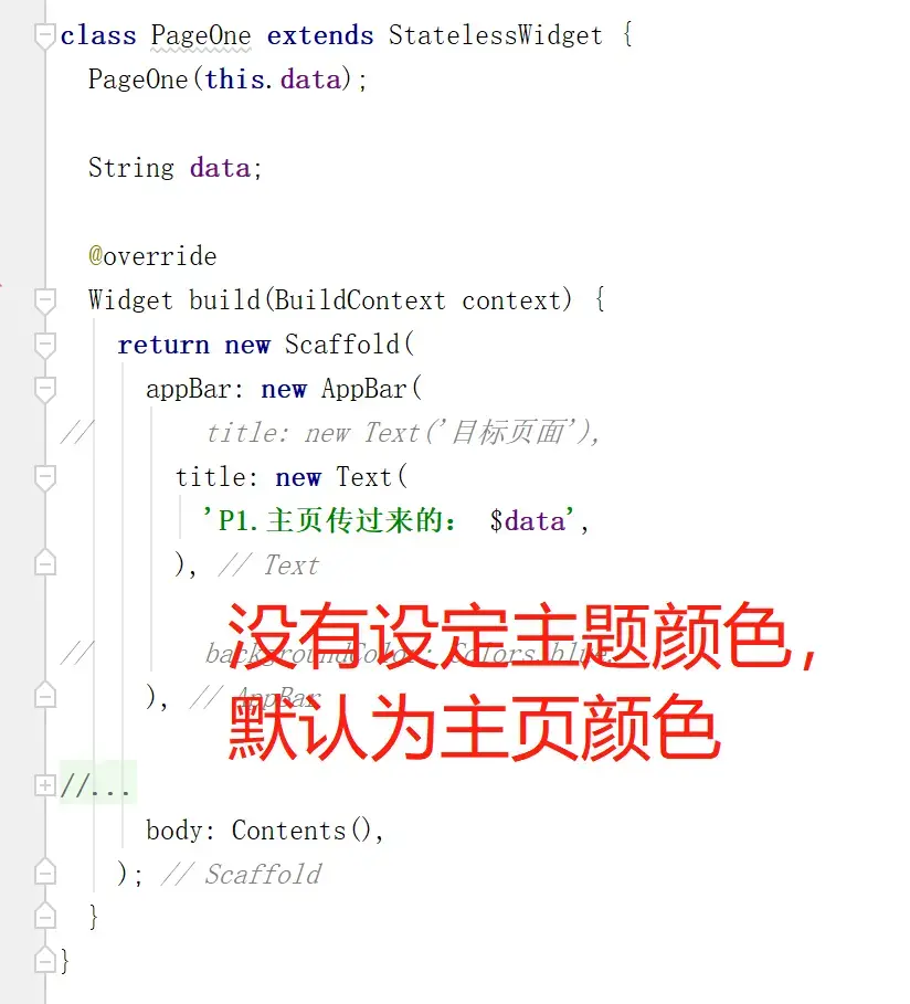 @override Widget build(BuildContext context) { return new Scaffold( appBar: new AppBar( // title: new Text('目标页面'), title: new Text( 'P1.主页传过来的: $data', ),