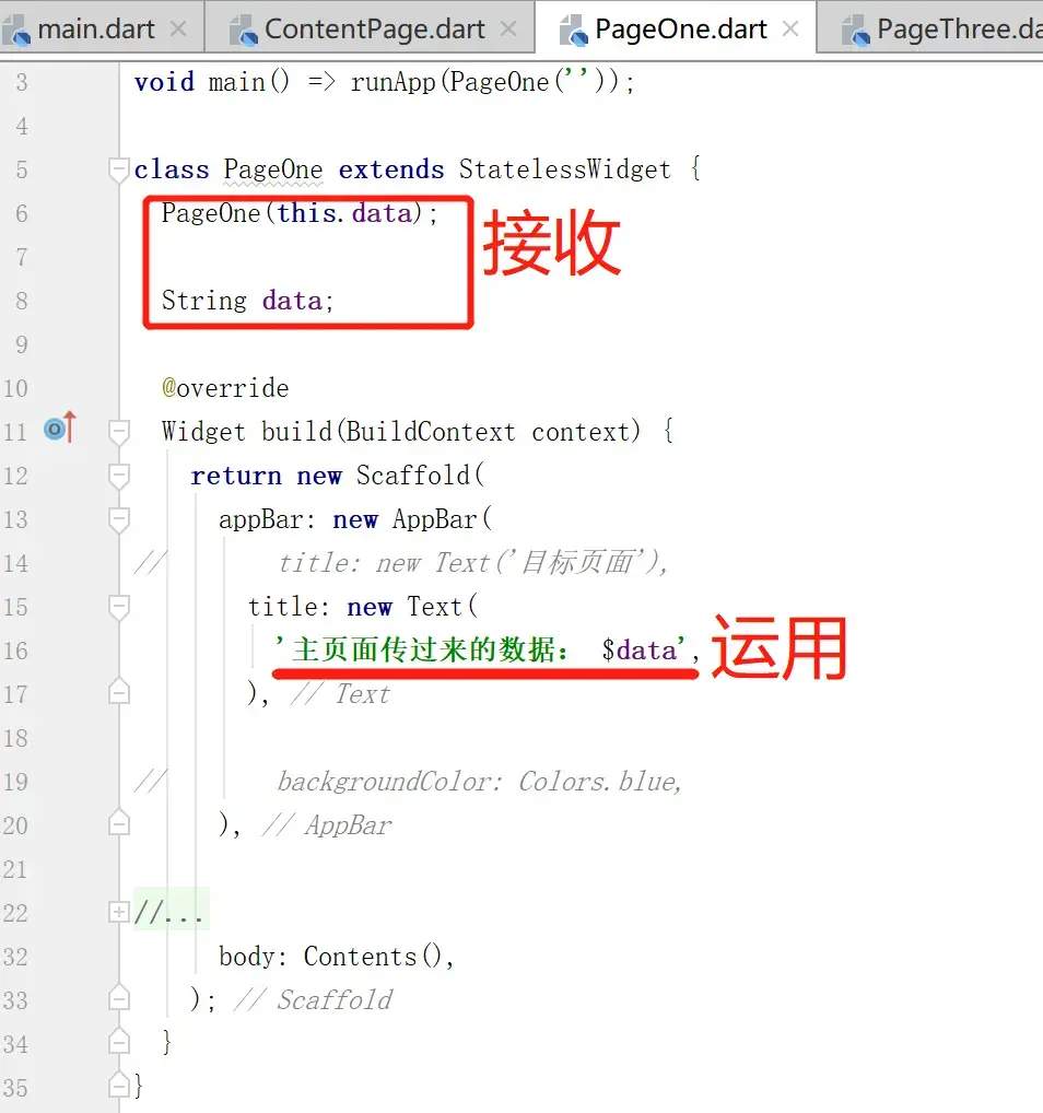 #两个页面间简单的页面传输 **【Push方向(发送数据),】 `ContentPage`跳转到`PageOne`, 把要传输的数据交给`PageOne`的`构造函数`, `PageOne`接收数据并显示: