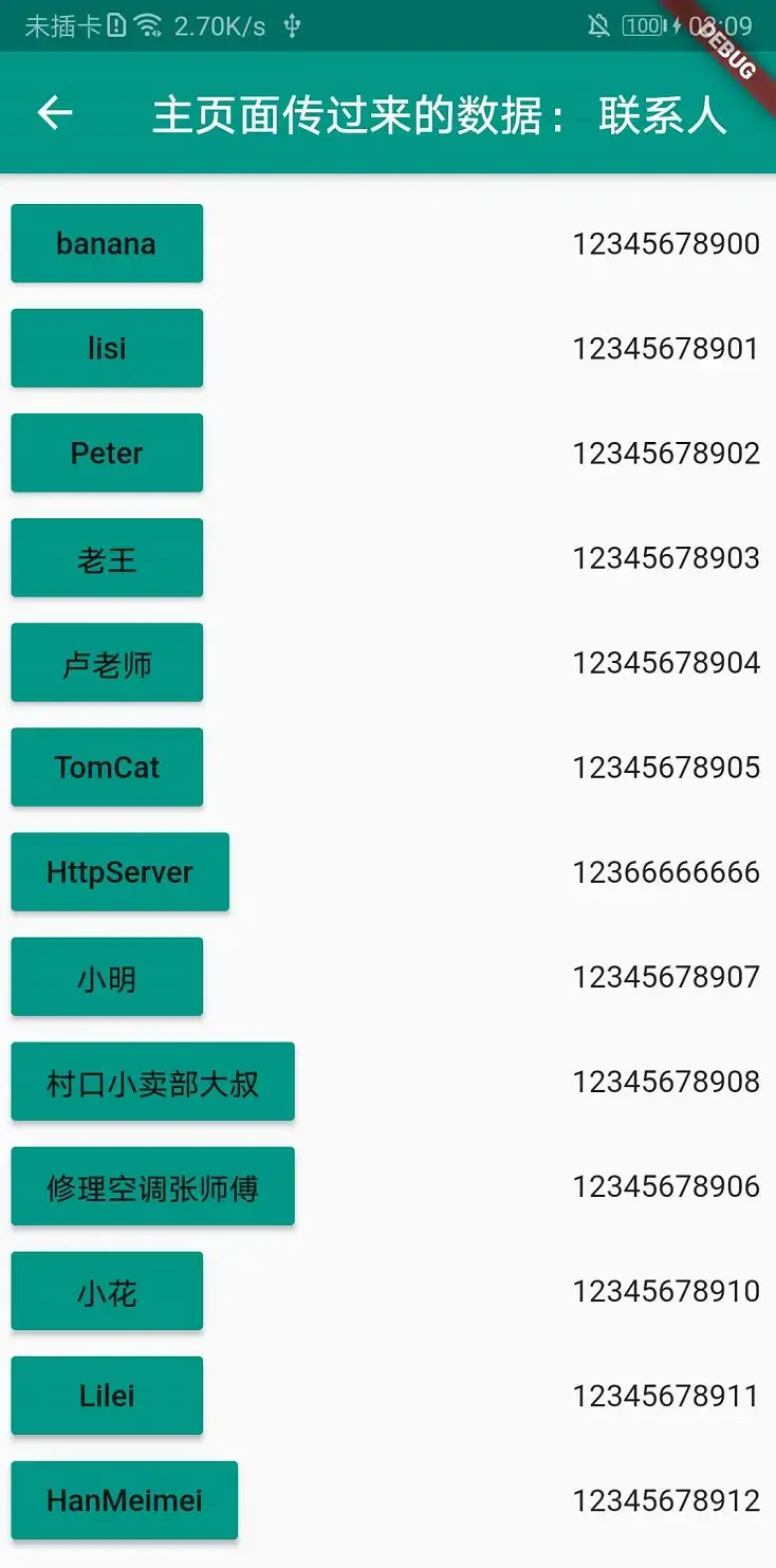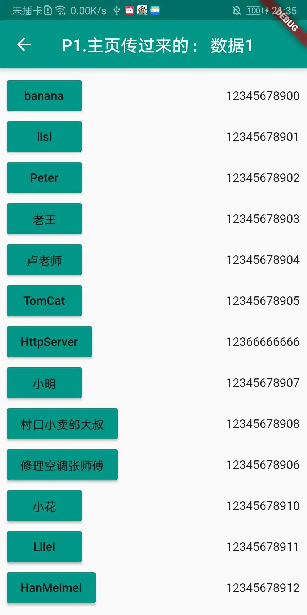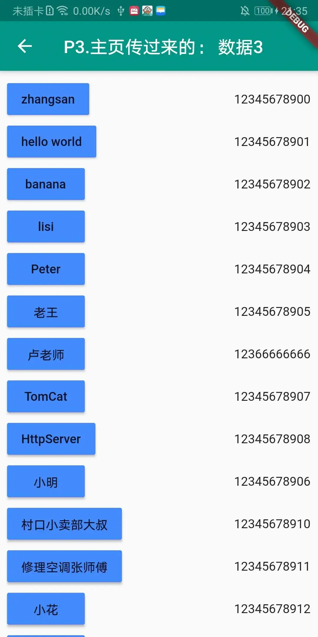 List names = [ 'banana', 'lisi', 'Peter', '老王', '卢老师', 'TomCat', 'HttpServer', '小明', '村口小卖部大叔', '修理空调张师傅', '小花', 'Lilei', 'HanMeimei', ]; List numbers = [ '12345678900', '12345678901', '12345678902', '12345678903', '12345678904', '12345678905', '12366666666', '12345678907', '12345678908', '12345678906', '12345678910', '12345678911', '12345678912', '12345678913', '12345678914', ];