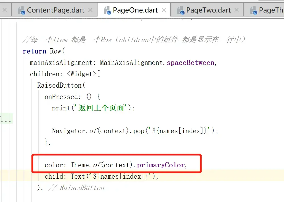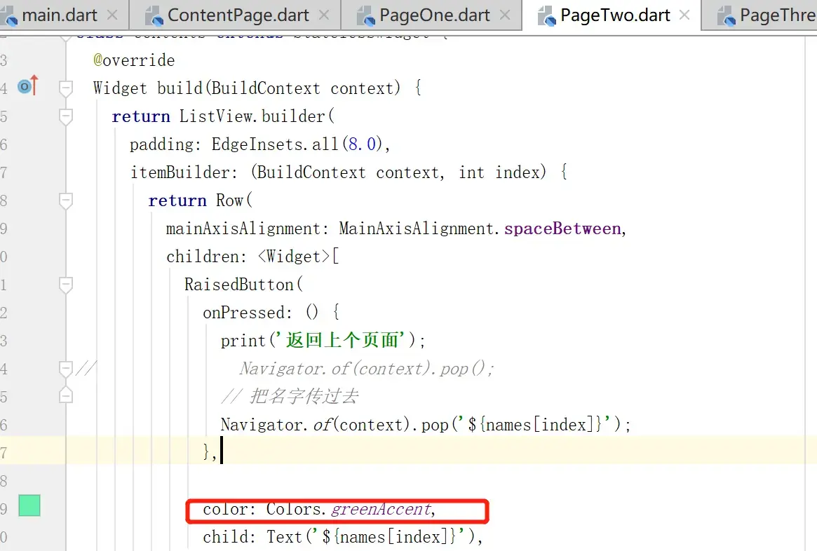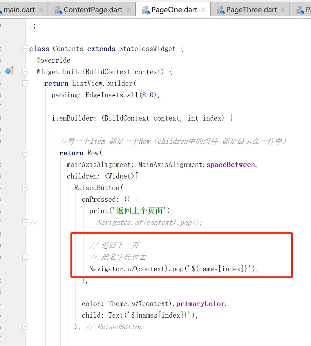 class Contents extends StatelessWidget { @override Widget build(BuildContext context) { return ListView.builder( padding: EdgeInsets.all(8.0), itemBuilder: (BuildContext context, int index) { return Row( mainAxisAlignment: MainAxisAlignment.spaceBetween, children: [ RaisedButton( onPressed: () { print('返回上个页面'); // Navigator.of(context).pop(); // 把名字传过去 Navigator.of(context).pop('${names[index]}'); },