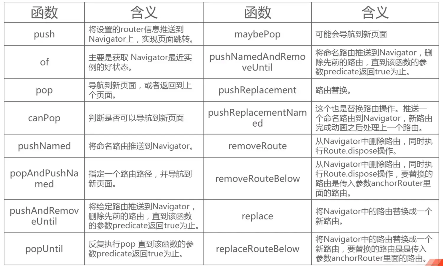 #路由常用API **左边列比较常用,右边列可作了解:`pushAndRemoveUntil`: 跳转到新的页面,并把当前的页面关闭;