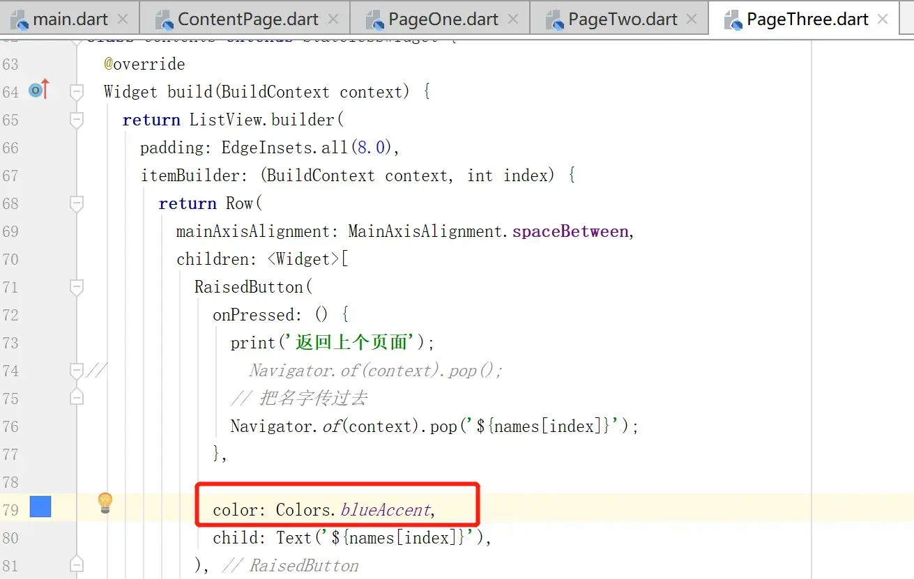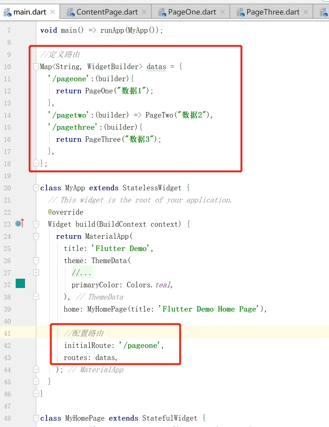 //定义路由 Map<String, WidgetBuilder> datas = { '/pageone':(builder){ return PageOne("数据1"); }, '/pagetwo':(builder) => PageTwo("数据2"), '/pagethree':(builder){ return PageThree("数据3"); }, };