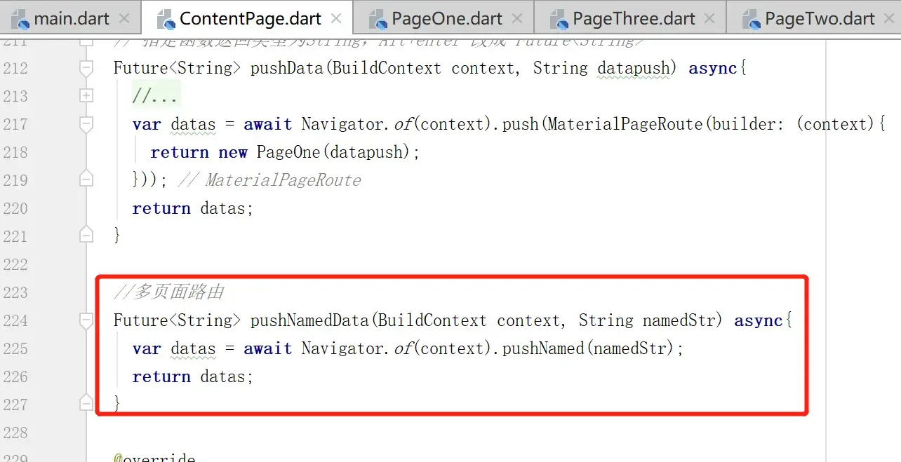 String results; String results2; String results3; //封装一个函数 处理路由返回的数据 // 接收数据是异步的,需要加 async关键字; // 需要接收数据,需要加 await关键字; // 需要准备一个数据类型变量,来承载; // 指定函数返回类型为String,Alt+enter 改成 Future Future pushData(BuildContext context, String datapush) async{ //Navigator 路由导航类 ********************************************** // of()返回一个NavigatorState,一个状态,包含了相关的一些属性之类的; // 通过这个状态实例,可以去调用里面的一些函数; // push()要求传入一个Route对象,一般用 MaterialPageRoute类 var datas = await Navigator.of(context).push(MaterialPageRoute(builder: (context){ return new PageOne(datapush); })); return datas; }