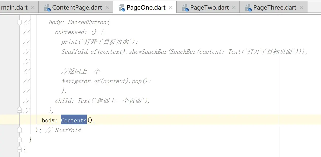 // body: RaisedButton( // onPressed: () { // print('打开了目标页面'); // Scaffold.of(context).showSnackBar(SnackBar(content: Text('打开了目标页面'))); // // //返回上一个 // Navigator.of(context).pop(); // }, // child: Text('返回上一个页面'), // ), body: Contents(), ); } }