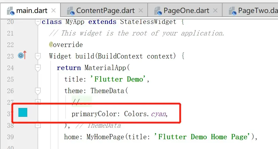 class MyApp extends StatelessWidget { @override Widget build(BuildContext context) { return MaterialApp( title: 'Flutter Demo', theme: ThemeData( primaryColor: Colors.teal, ), home: MyHomePage(title: 'Flutter Demo Home Page'),