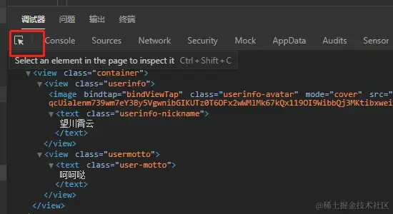 通过调试模块左上角的选择器, 还可以快速找到页面中组件对应的wxml代码:
