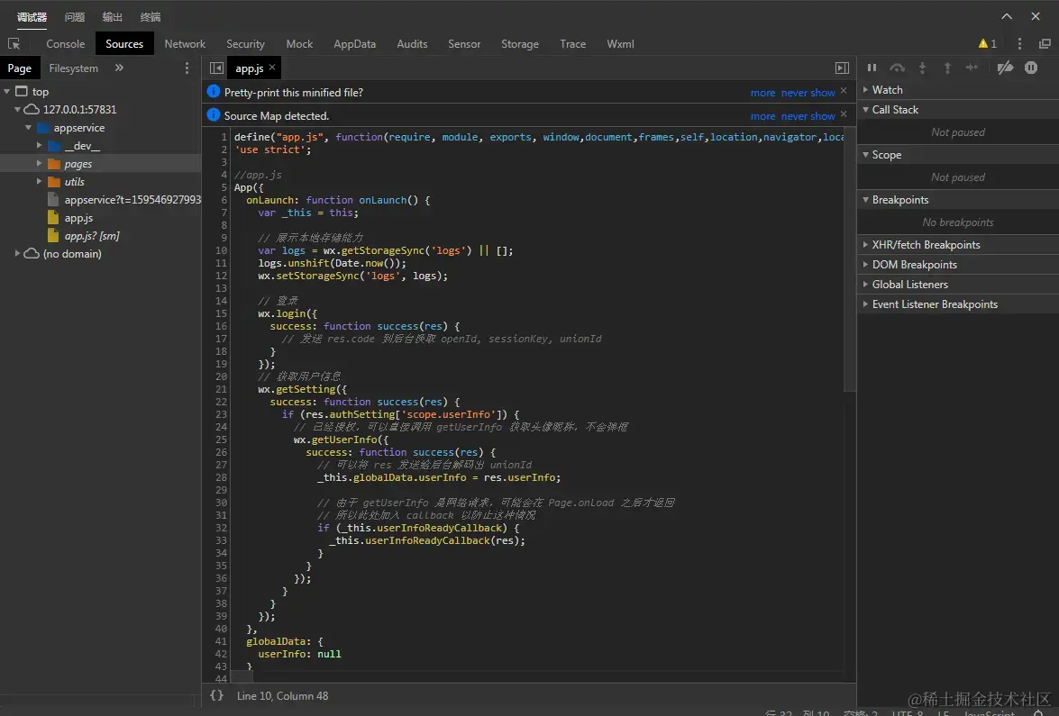 微信小程序框架 会对 脚本文件 进行编译的工作, 所以在 Sources面板中开发者看到的文件 是经过处理之后的 脚本文件, 开发者的代码 被包裹在 define函数中;