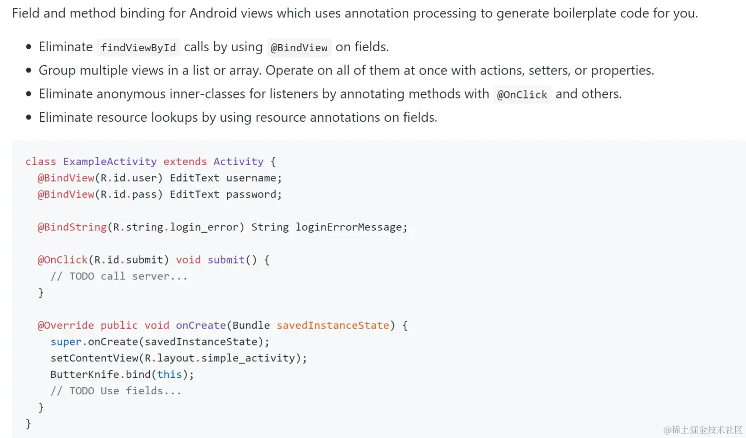Android视图字段和方法的绑定,使用注释处理为开发者生成样板代码(generate boilerplate code);