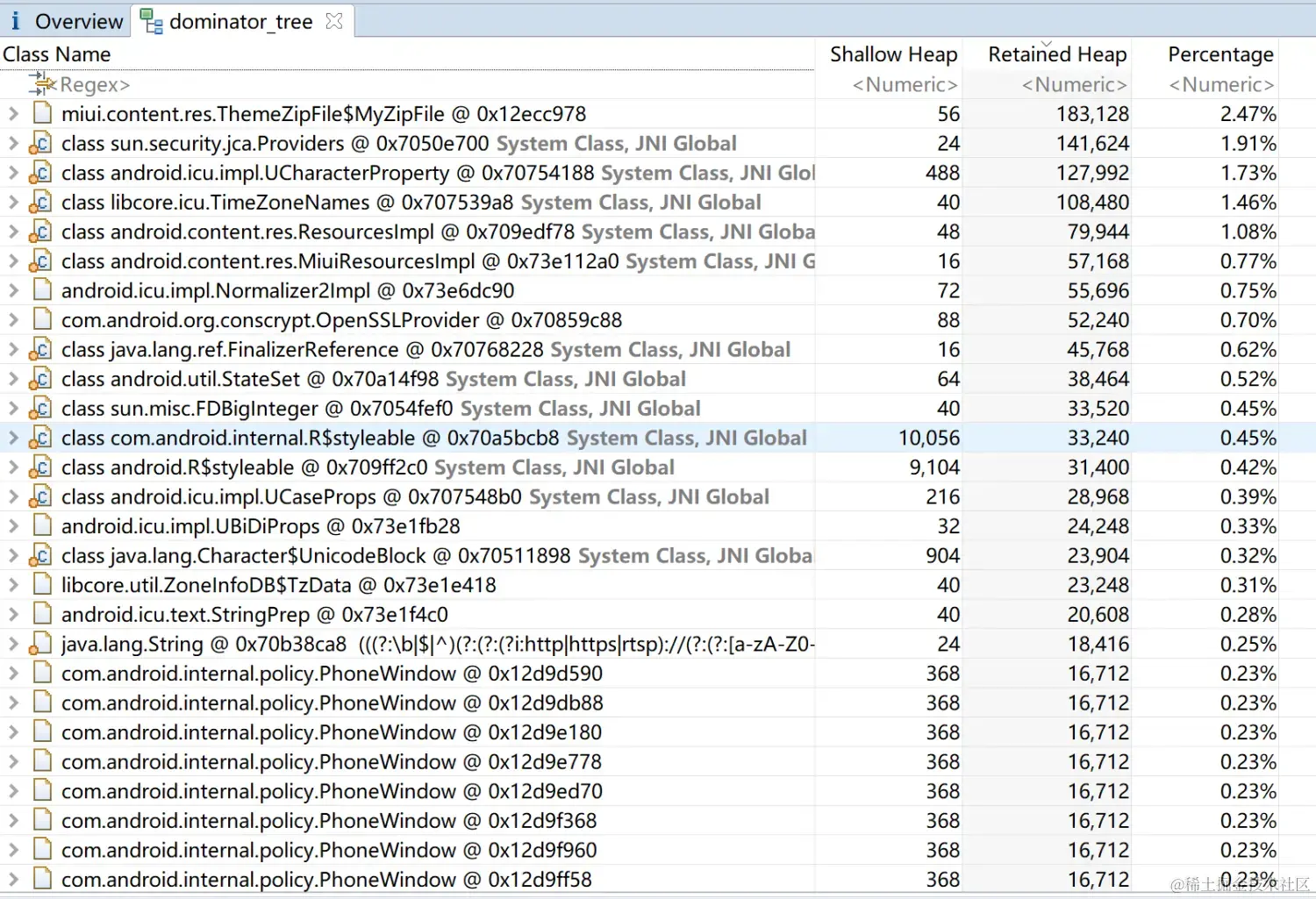 第三个按钮,Dominator Tree(Dominator n.支配者,支配力,统治者;) 视图展示 每一个类型对象的 支配树(注意是每一个对象!!):