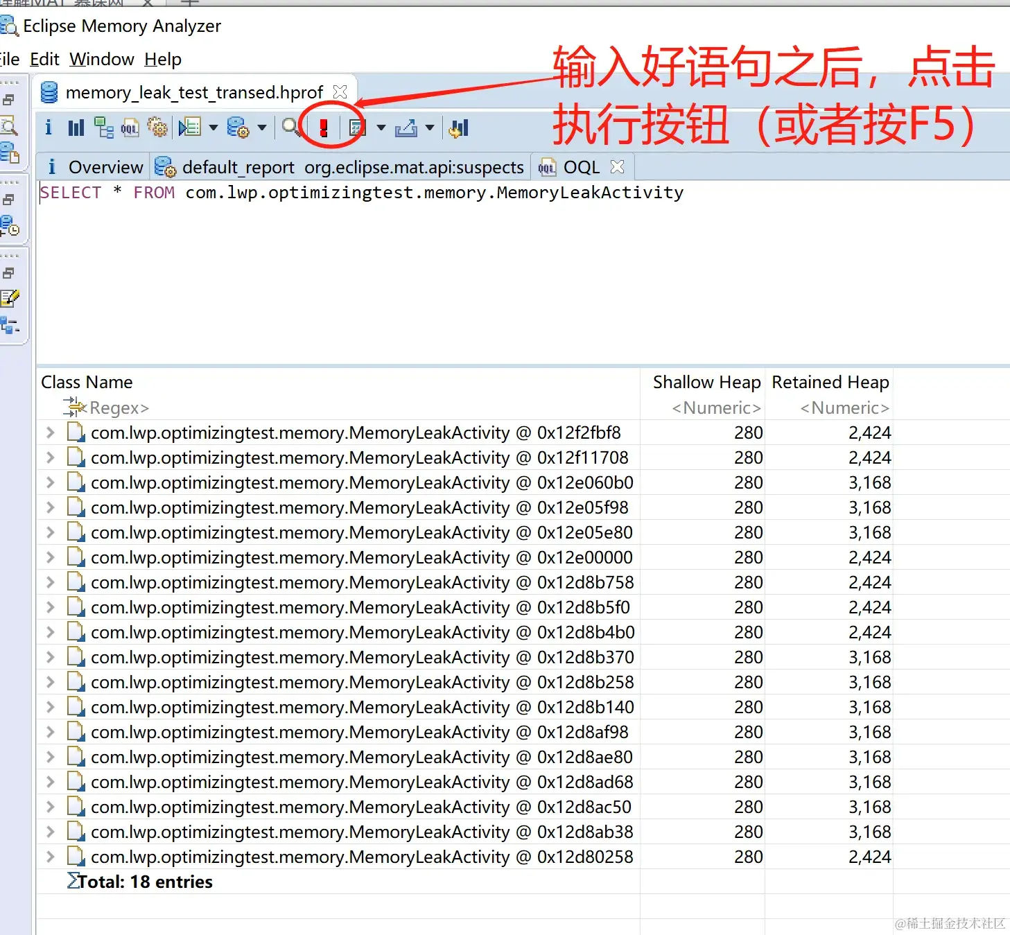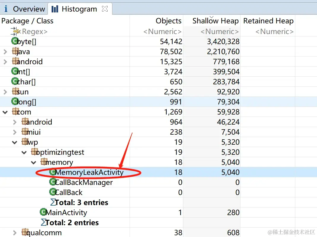 检索具体的某一个类的信息, 从而来判断该对象有没有存在内存泄漏的可能, 比如我们在上一篇博客《Android | App内存优化 之 内存泄漏 要点概述 以及 解决实战》, 检索的就是MemoryLeakActivity;
