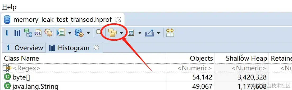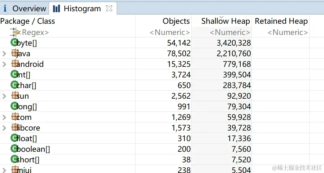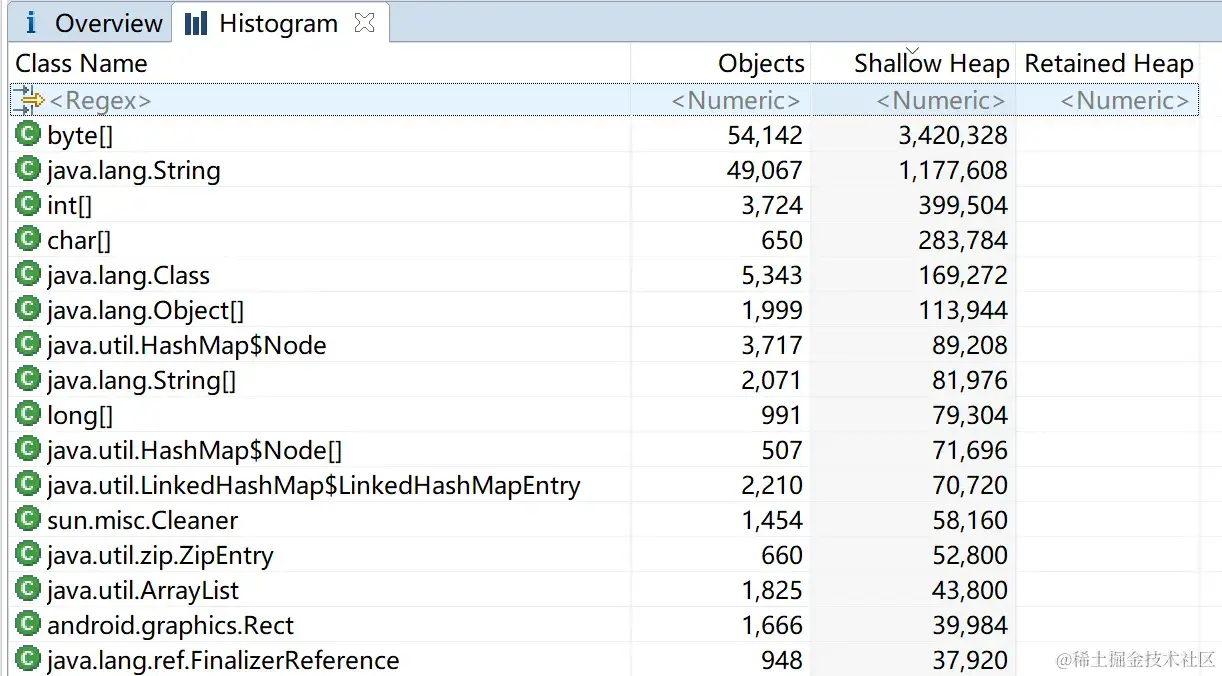 Histogram(单词是直方图的意思),该视图可以列出来, 某一个具体的Class它到底有多少实例,一个某一类型实例它的个数,及其 Shallow Heap,堆中 此类型所有实例 自身的总大小(以字节为单位), Retained Heap,为 此类型的所有实例 而 保留的内存总大小(以字节为单位), (在引用链上,此类型的所有实例占用的内存);