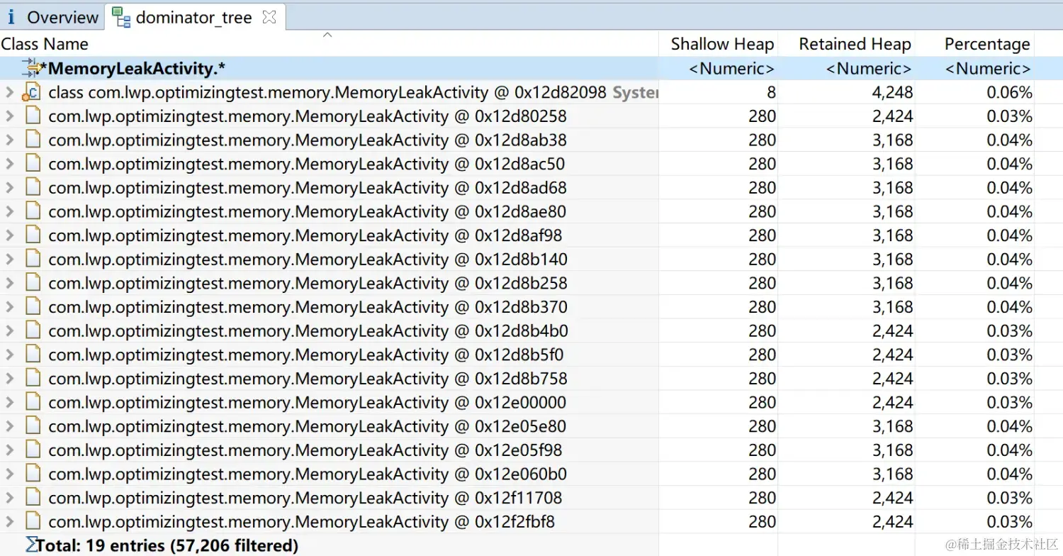 Percentage这个栏目, 显示的值 即该类型对象总共占了所有对象的百分之几; 比如说我们还是检索一下MemoryLeakActivity(注意这个视图也能够检索!!)这里也能够,右键, 选择