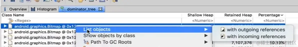 List objects -> with incoming references, 我们在排查内存泄漏的过程中, 应该选择with incoming reference进行分析才行,!!!!!查看 本(我们这个) 类型实例 被 谁/哪些类型实例 所引用,!!!!! 导致我们这个类型实例自身不能被回收,!!!!! 【!!!! 因为之所以内存泄漏, 就是某些没用的实例没有被及时正确回收, 而某个实例被别人引用了,也就回收不了了; !!!!】 (List objects下有两个菜单项,with incoming referenceincoming 指过来 即指的是 引用到该选中实例的实例, 即查看 本 类型实例 被 谁/哪些类型实例 所引用;