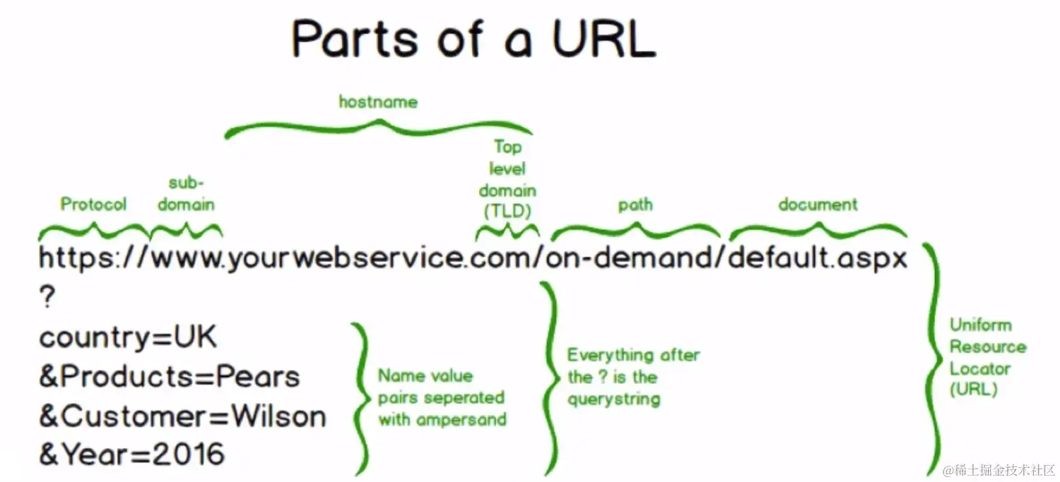 - 接着是协议(protocol)、 子域(subdomain-域名的一部分,通常是一个网络、大学、公司等)、 主机名(hostname)、 Top level domain(TLD-顶级域名)