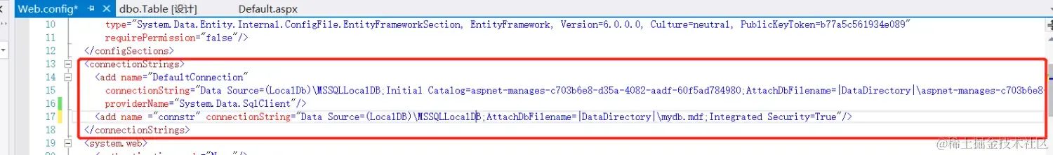 <add name ="connstr" connectionString="Data Source=(LocalDB)\MSSQLLocalDB;AttachDbFilename=|DataDirectory|\mydb.mdf;Integrated Security=True"/>