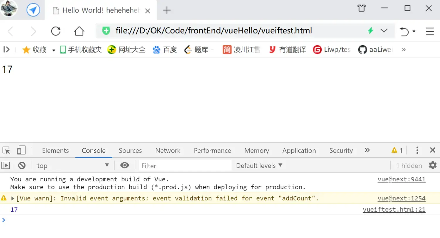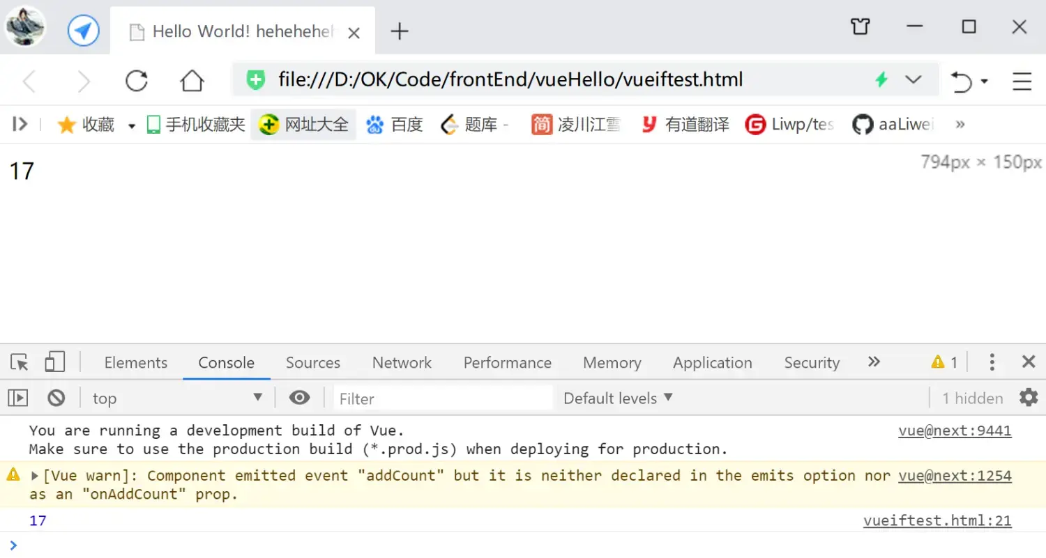 **当然 父组件 接收 子组件参数 后的 计算逻辑, 可以在 子组件传参 的时候 计算完成 再传给`this.$emit()`! 父组件接收时,直接 受值即可(`handleItemEvent(count)`);** ``` ``` 效果同上一个例子;