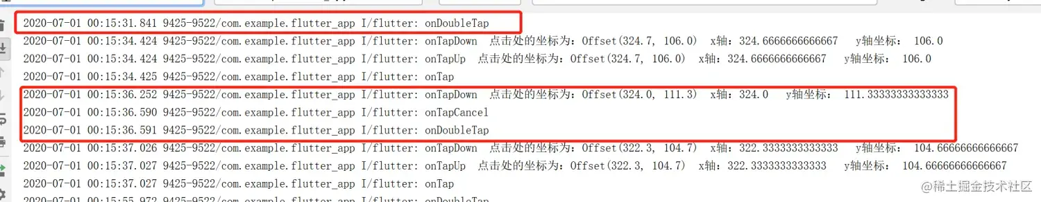 双击文本组件,log如下【可以看到相关回调方法的顺序(双击可能有两种回调顺序)】: