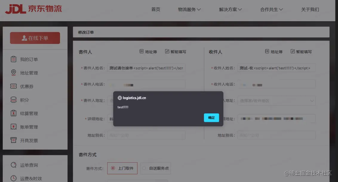 - 在搜索框、输入框、备注信息中输入测试语句:;看是否会有弹框展示。