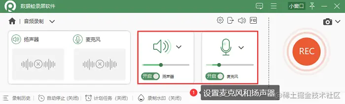 步骤2: 点击安装好的软件,进入【音频录制】,打开麦克风(录制内部声音)或扬声器(录制外部声音)调整音量,点击【REC】开始录制。