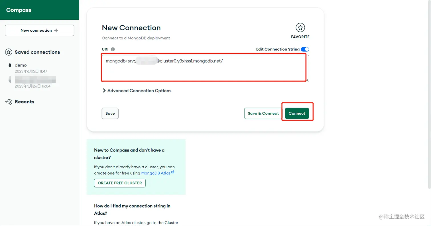 5. 打开MongoDB Compass,粘贴uri到输入框,修改uri里的用户名/密码为第3步创建的用户名/密码