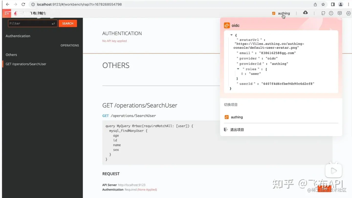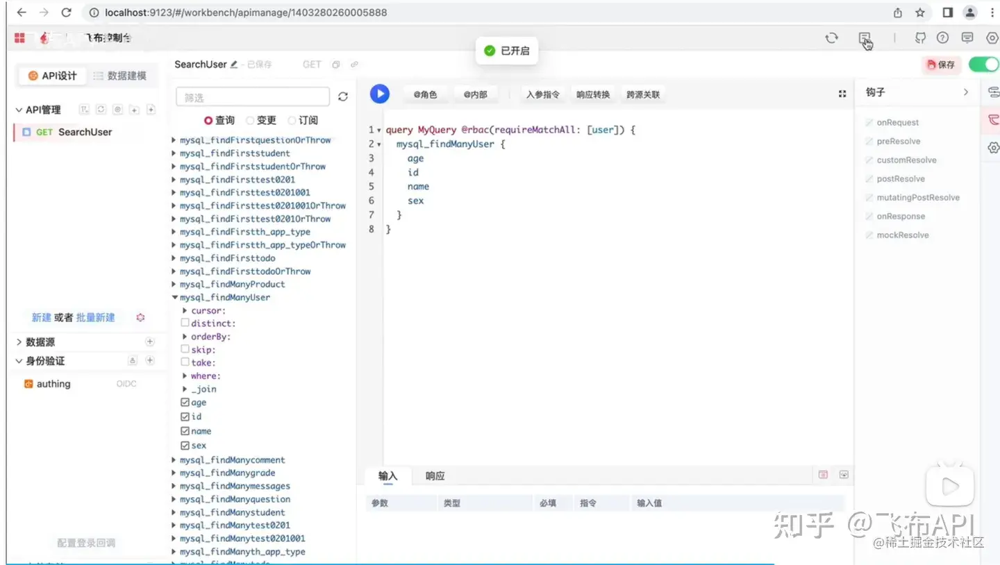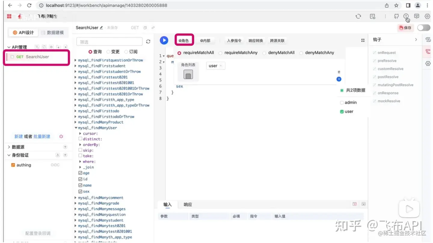 编写完成后,新建一个搜索用户的API,并点击@角色按钮,添加user角色,点击保存并上线。