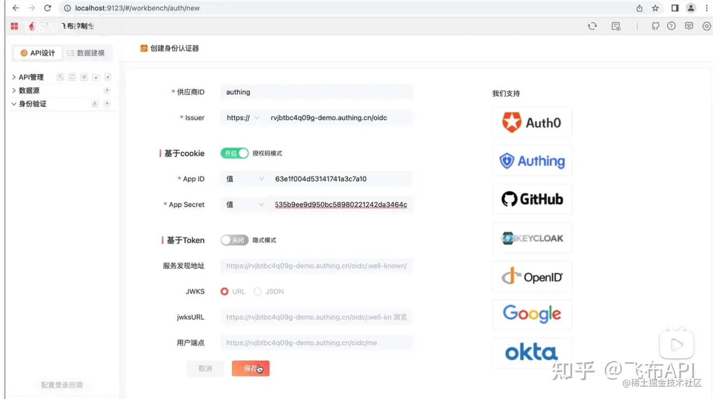 首先,在API设计界面下的身份验证一栏中点击加号按钮,创建一个身份认证器,输入供应商ID,获取Issuer、APP ID 和 APP Secret, 点击保存。