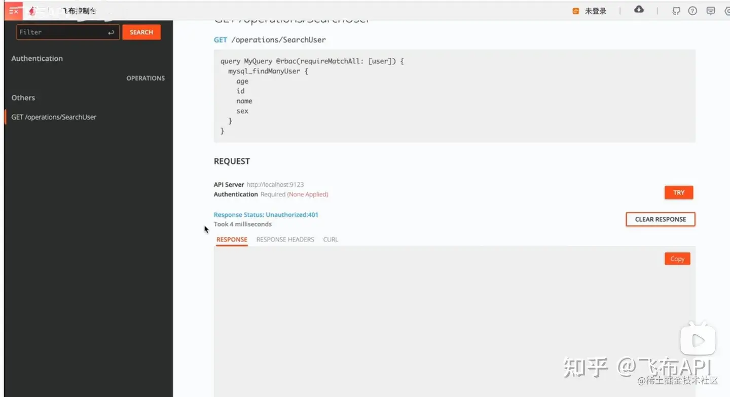 点击进入API预览页,选择当前API。可以看到,在未登录状态下,无法获取到响应的返回值。