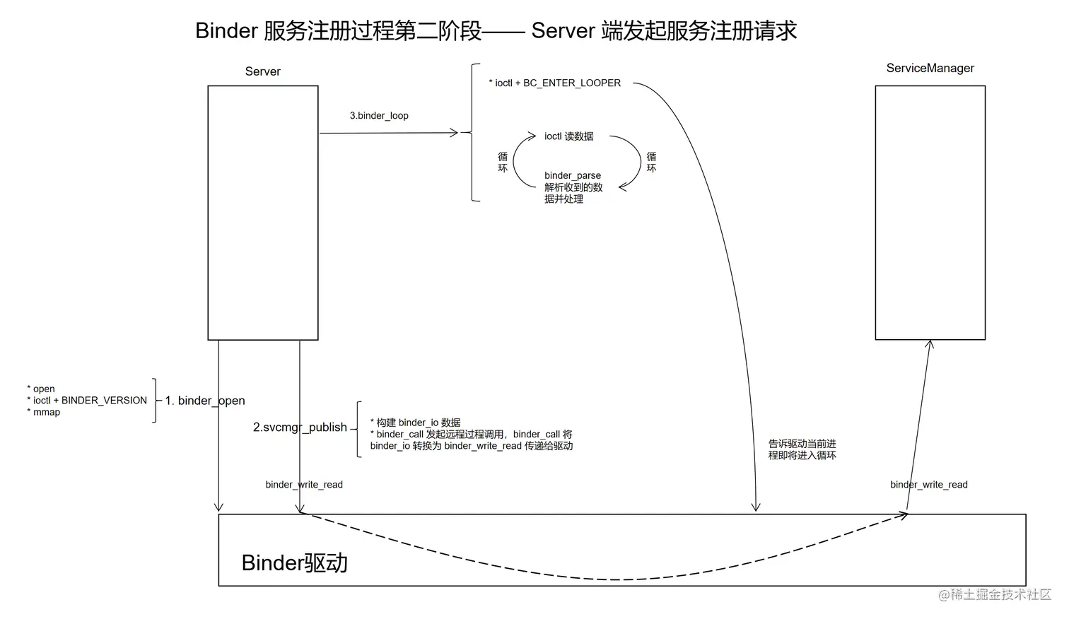 Server 端在完成写操作后,会立即进入读操作,并阻塞,当 ServiceManager 发回返回数据时被唤醒: