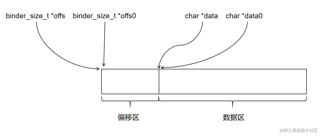 从 binder_io 的定义和初始化过程中可以看出,binder_io 用于管理一块内存,同时将内存分为了两部分管理: