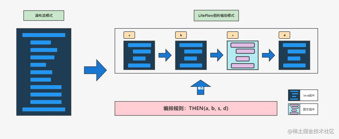 利用LiteFlow,你可以将瀑布流式的代码,转变成以组件为核心概念的代码结构,这种结构的好处是可以任意编排,组件与组件之间是解耦的,组件可以用脚本来定义,组件之间的流转全靠规则来驱动。