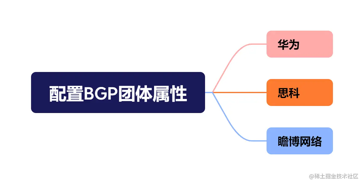 下面我们以华为、思科、瞻博网络三个厂商为例,简单给大家介绍一下该如何配置BGP团体属性。