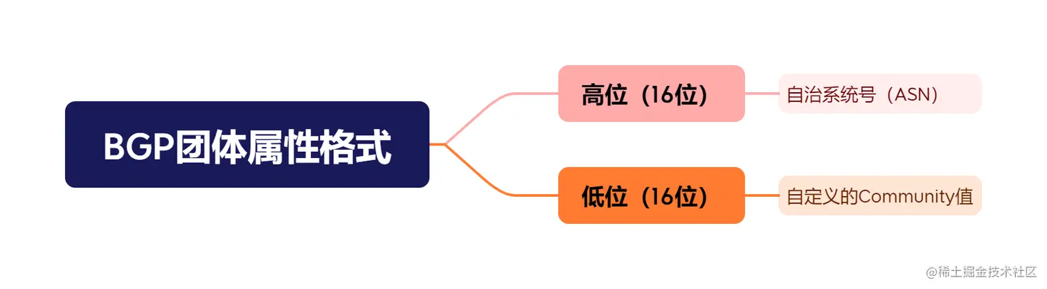 Community团体属性由32位的数字表示,通常采用两个16位的数字组成,称为高位和低位。其中,高位通常表示自治系统号(ASN),低位则是自定义的Community值。