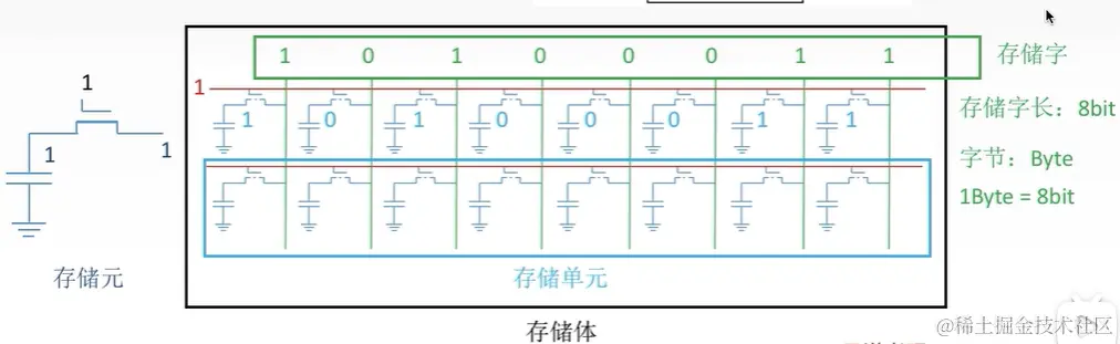 存储元:即存储二级制的电子元件(电容),每个存储元可存放一个bit