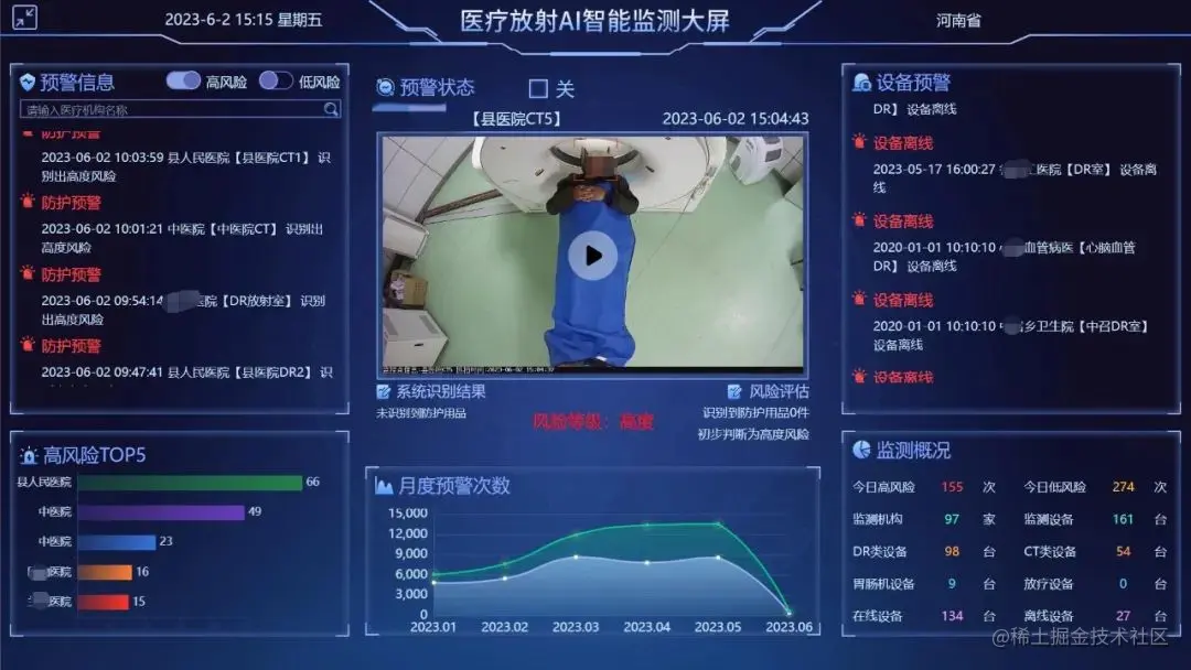 立足于河南省“智慧卫监”的探索方向,中盟新云创新性地将 AI 图像识别技术运用到放射防护监管领域中。据调查,当时市面上流行的通用图像识别模型缺乏针对性训练,仅能识别是否有人,无法精准的识别出是否穿戴防护用具,更无法识别数十种之多的防护用具品类、不同医院使用的不同制式。而业内做得比较好的大公司对此类项目缺乏重视,虽有尝试,但专业研发人员投入不足,最终效果也不理想。中盟新云希望能够结合自身对于行业的深刻洞察,让专业的行业知识快速与 AI 能力结合,从而更好地解决这一问题。
